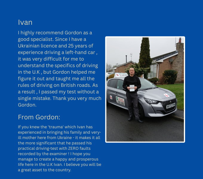 including 3 star skidpan driver training. I am a grade 5 approved driving instructor (2nd highest).